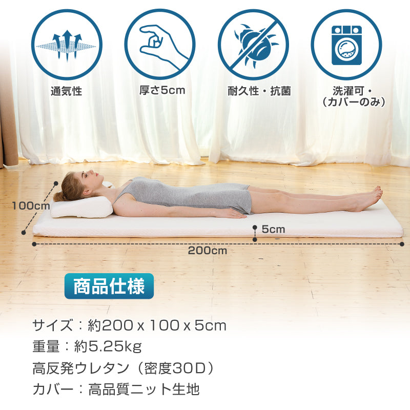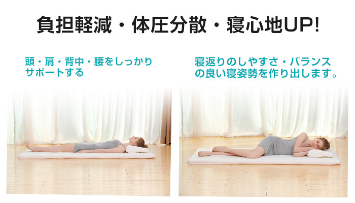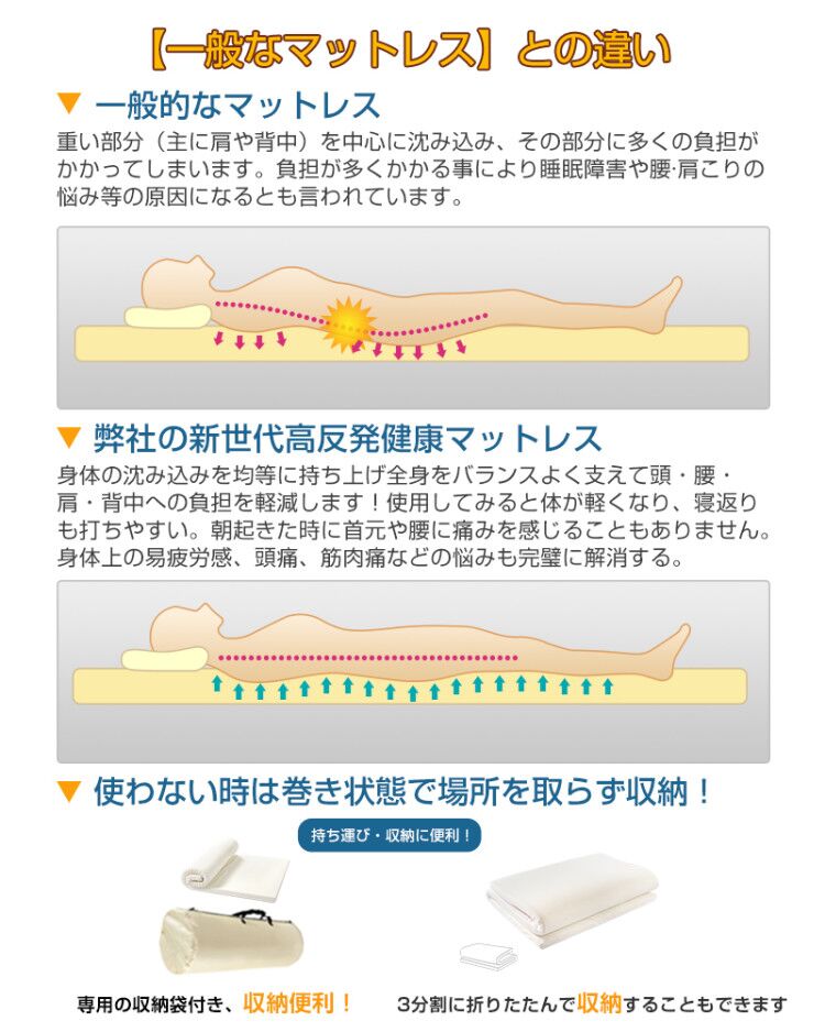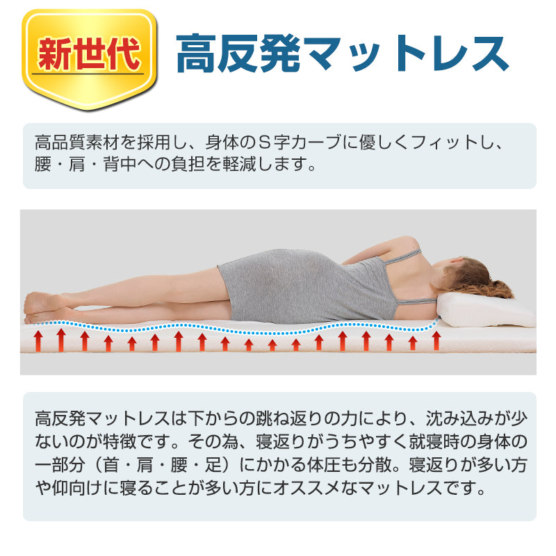 •復元力と耐圧分散に優れた高反発ウレタン使用、肩や腰部分の沈み込みを少なくし、全身を均一に支え理想の寝姿勢を実現。やや硬めの寝心地です(高反発≠硬い)。高反発マットレスは体圧を均一に分散し、押し上げる力があるため、負担がかかりやすい腰回りも持ち上げるようにして、過度な沈み込みのない快適で理想な寝姿勢を作り出してくれます。